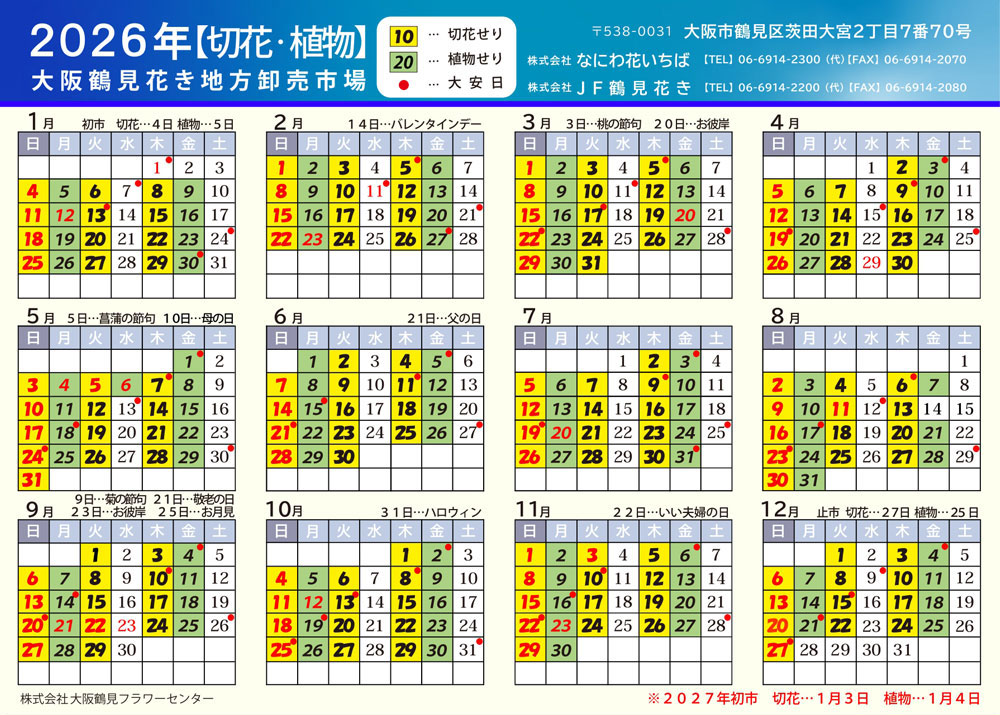 大阪鶴見花き地方卸売市場2026年カレンダー